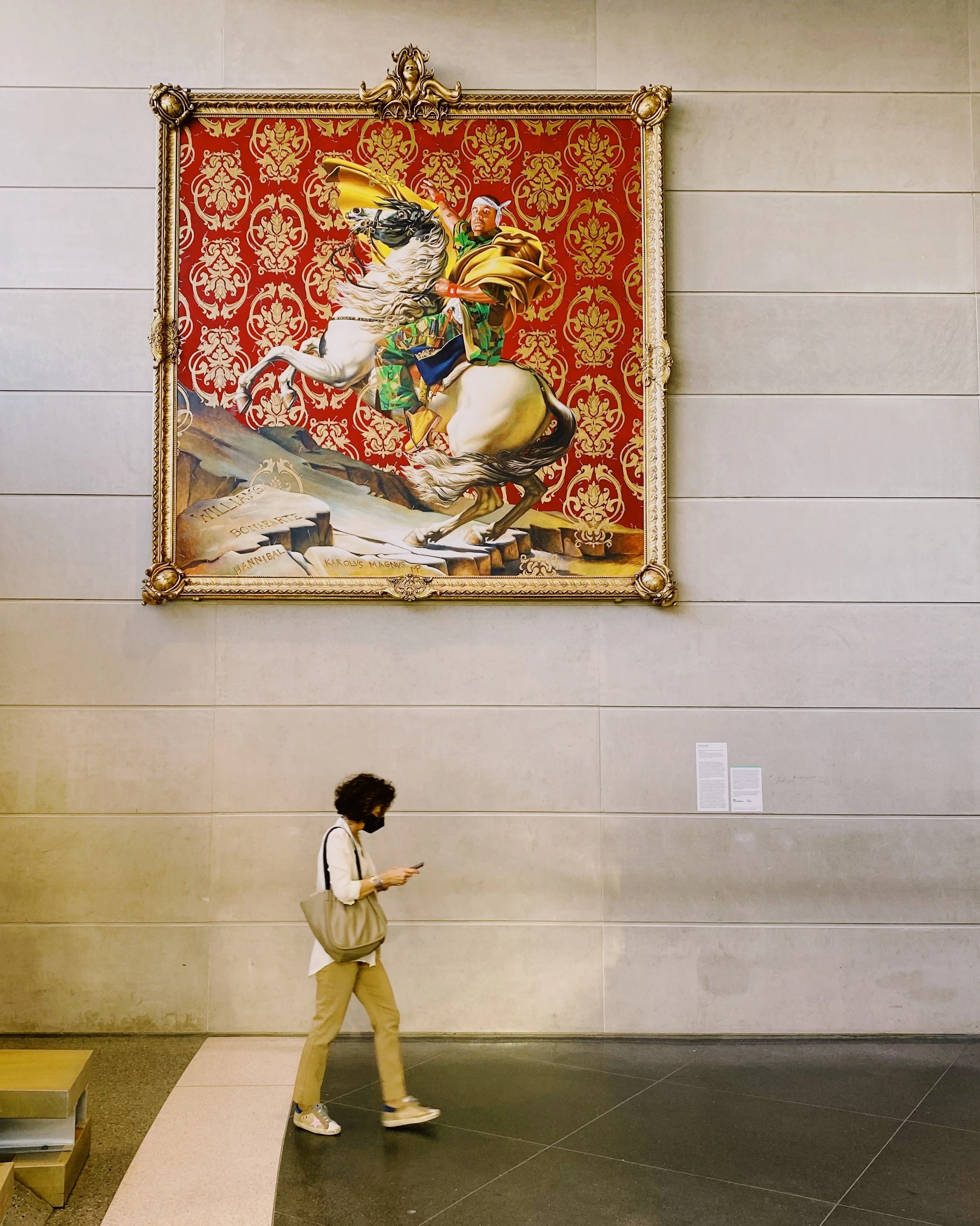 The painting is part of a series that Wiley made in the early 2000s. He recruited subjects from his Harlem neighborhood and invited them to look through art history books and choose a pose. Wiley would then paint the (anonymous) subject, in their street clothes, into canonical artworks of political and religious authorities. Wiley is not rewriting art history, so much as making evident the gaps in our visual archive. His contemporary work throws historical absences into higher relief.